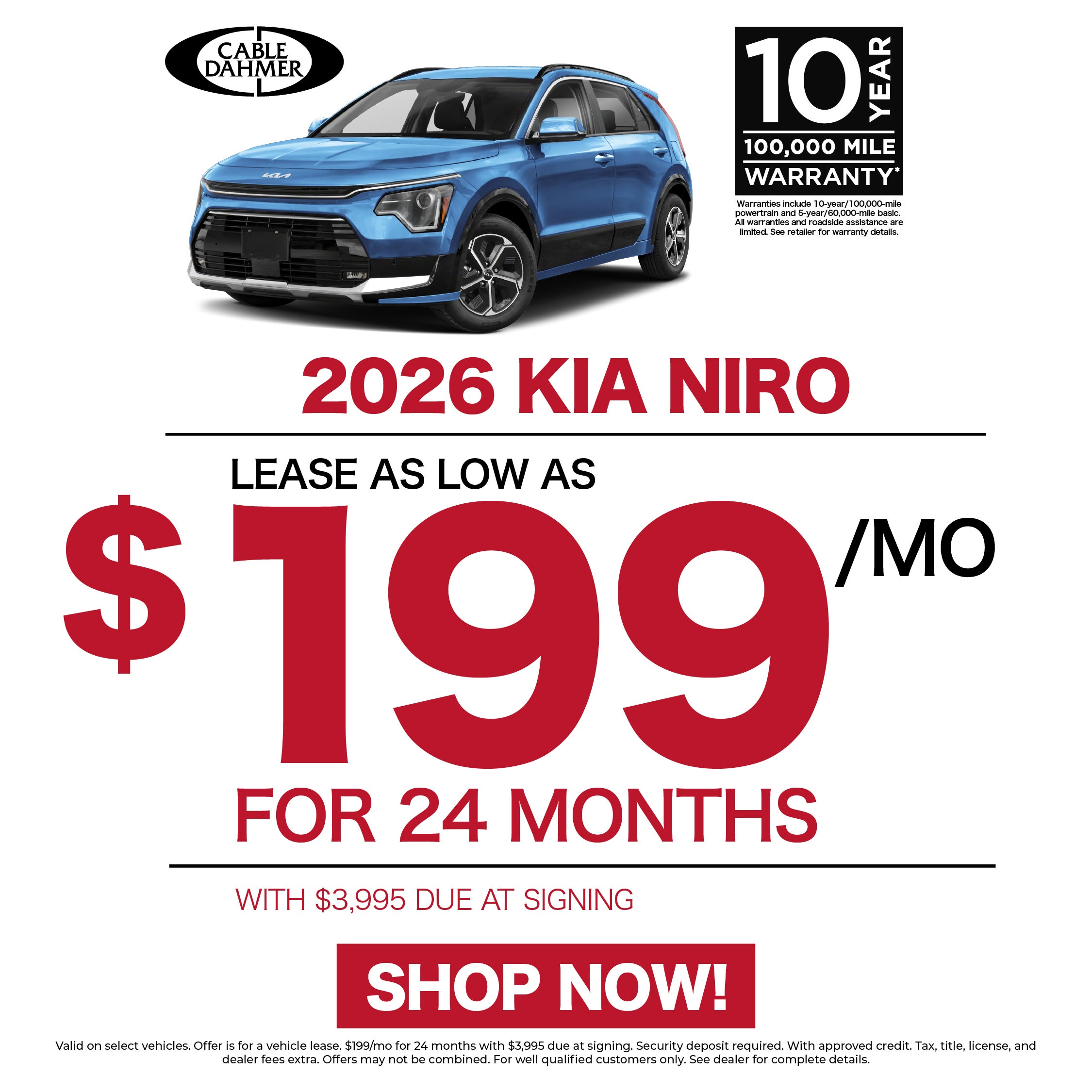Valid on select vehicles. Offer is for a vehicle lease. $199/mo for 24 months with $3,995 due at signing. Security deposit required. With approved credit. Tax, title, license, and dealer fees extra. Offers may not be combined. For well qualified customers only. See dealer for complete details.