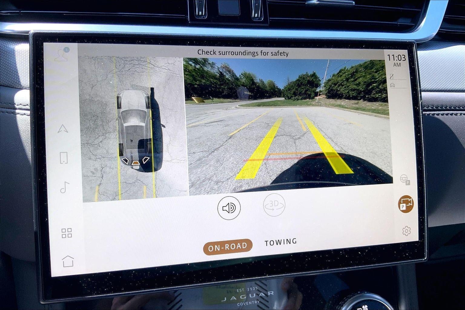 - The vehicle is equipped with a camera that displays an image of the area behind the vehicle on an interior display.