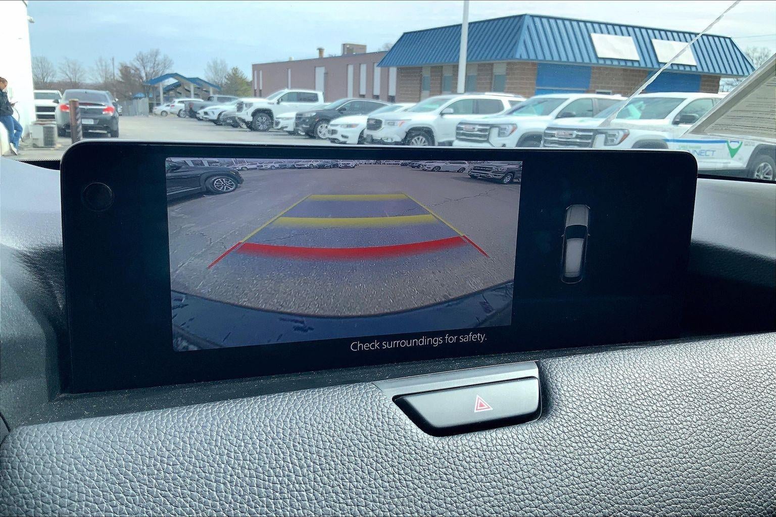 - The vehicle is equipped with a camera that displays an image of the area behind the vehicle on an interior display.