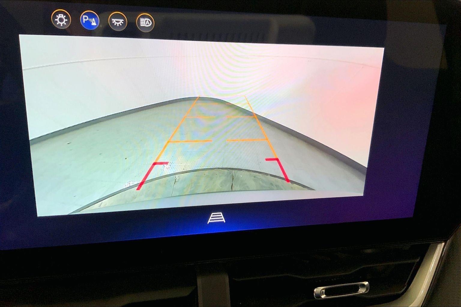 - The vehicle is equipped with a camera that displays an image of the area behind the vehicle on an interior display.