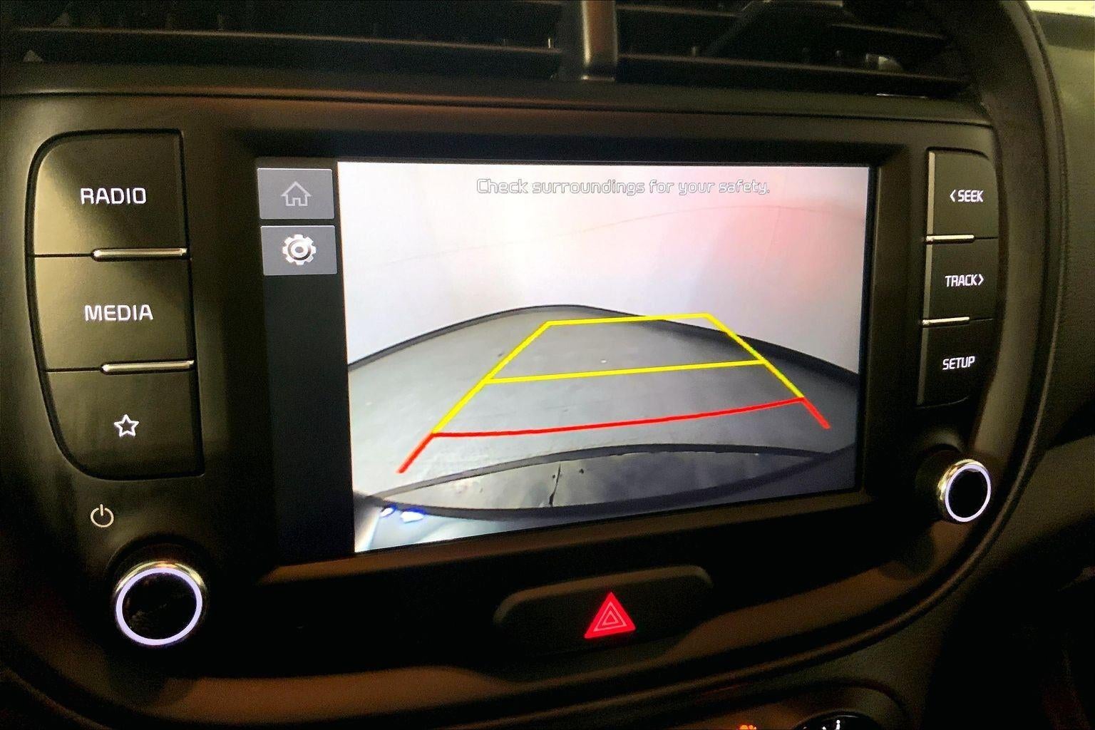 - The vehicle is equipped with a camera that displays an image of the area behind the vehicle on an interior display.